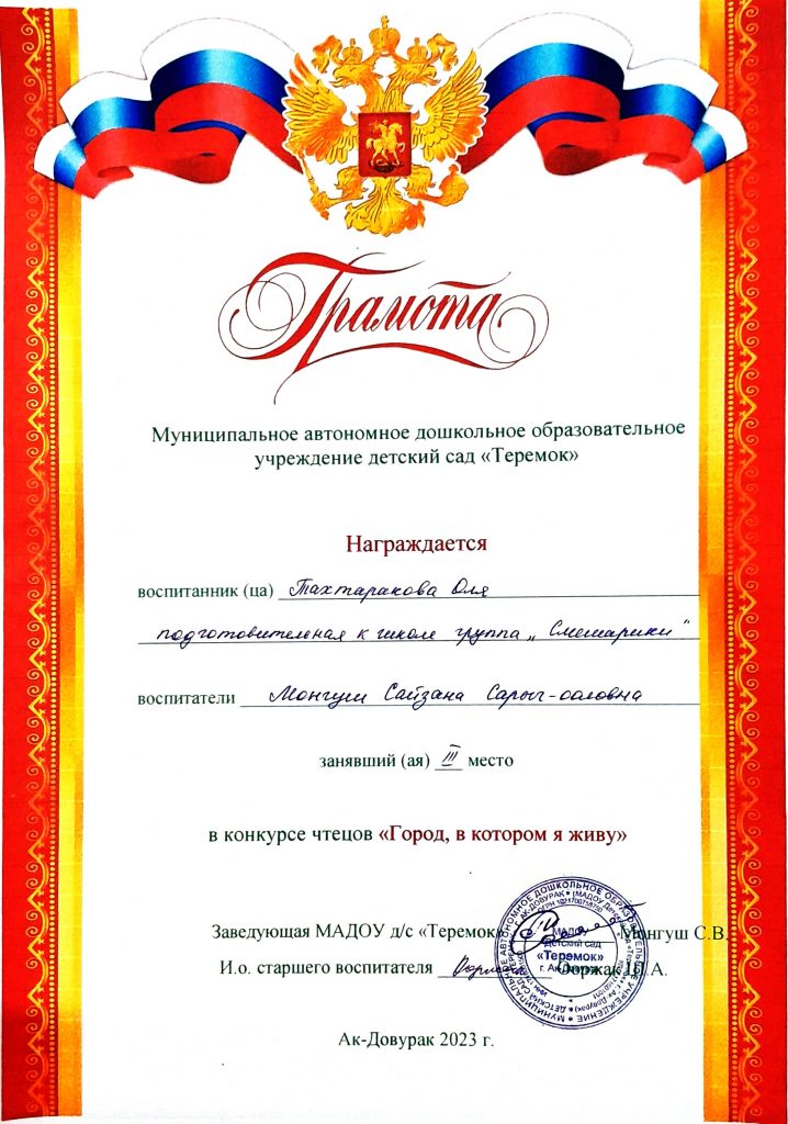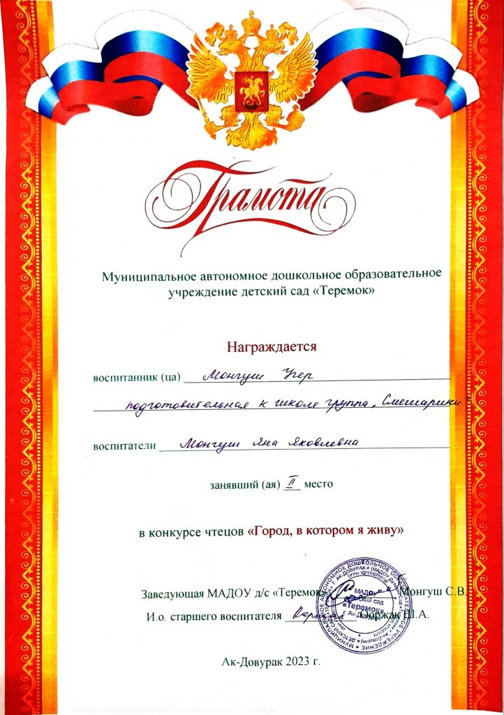 16 октября 2023г на основании годового планирования Управления образования, в нашем детском саду был проведен конкурс чтецов «Мой город-в котором я живу». Конкурс проводился согласно разработанного положения с целью речевого развития и формирования интереса к художественному слову. В конкурсе приняли участие 5 воспитанников подготовительной к школе группы «Смешарики». В конкурсе были предоставлены 1,2,3 места и следующие номинации: «За четкую речь при исполнении», «За самое эмоциональное исполнение». Пришли в гости и родители конкурсантов, чтобы поддержать своих детей. Все участники замечательно рассказывали стихотворения разных авторов. Эти стихотворения, в детском исполнении, не оставили никого равнодушным. Каждый участник получил грамоту и сладкий приз. https://vk.com/wall-217249658_666