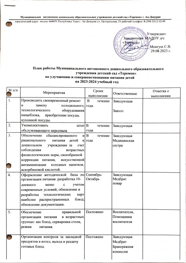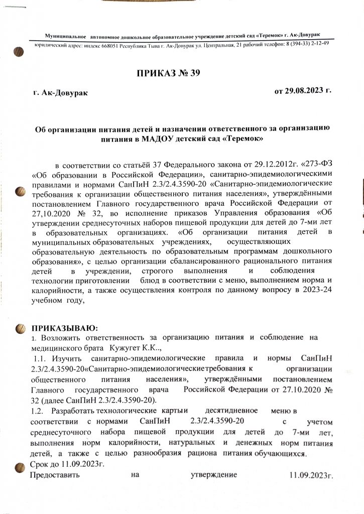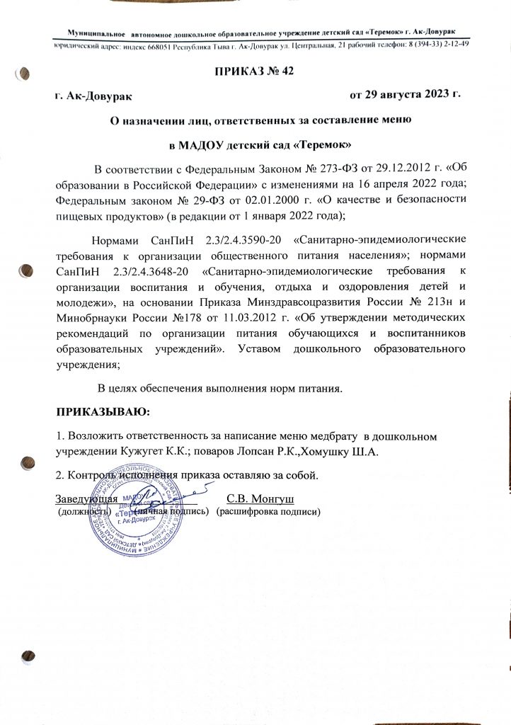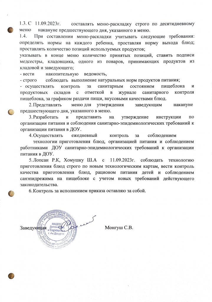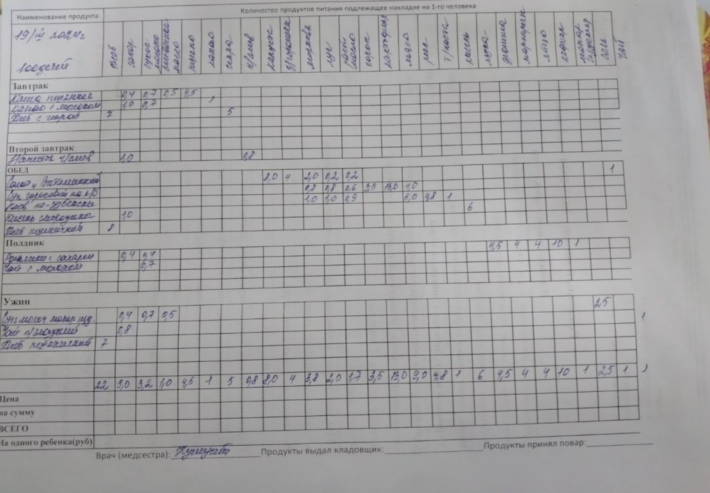 - Составление примерного двухнедельного меню с учётом возраста детей, сезонности, необходимого количества основных пищевых веществ, витаминов, микроэлементов.