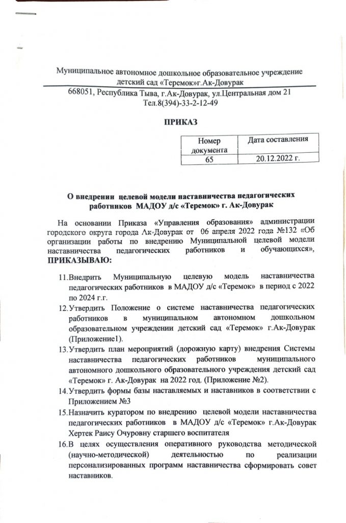 Положение о системе наставничества педагогических работников МАДОУ д/с «Теремок» УО г.Ак-Довурак Скачать